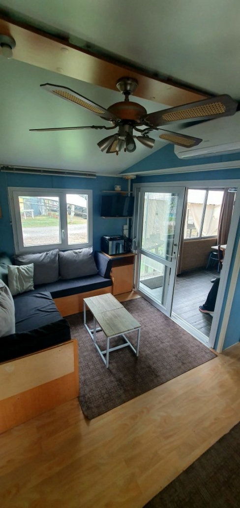 Totalmente rodeados de hierba, y, en una situación inmejorable dentro del camping, amplia terraza para disfrutar al sol o resguardarse de la lluvia, para disfrutar de un bungalow en el Pirineo Aragonés.