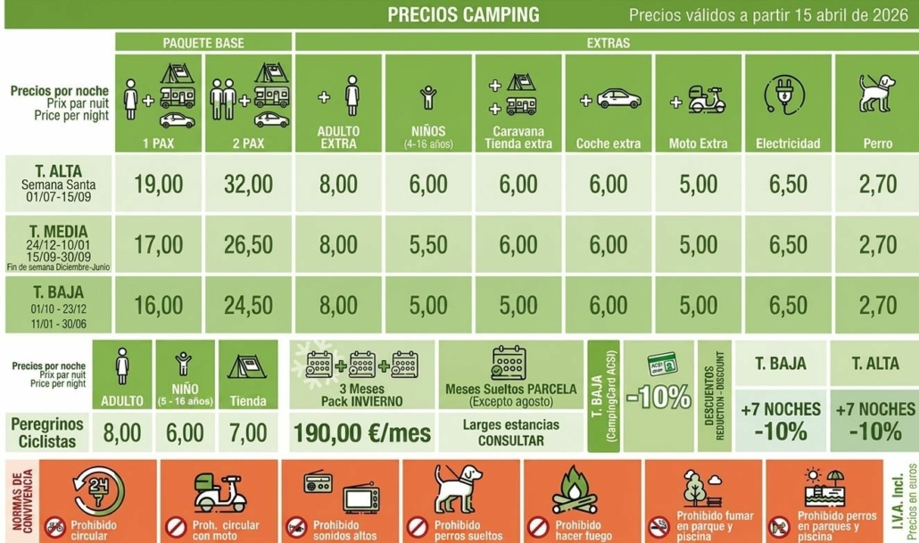 Tarifas, especificando packs y extras, ofertas para campistas, peregrinos, ciclistas, aventureros.